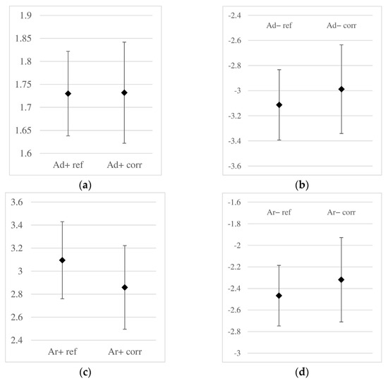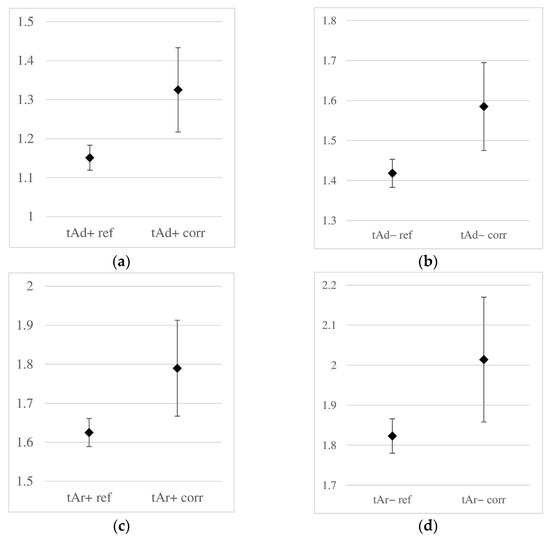 Obtained amplitude ranges [V] of the reflected wave (non-corroded, data with the “ref” index) and corroded (with the “corr” index) samples: (a) amplitude Ad+, (b) Ad−, (c) Ar+, (d) Ar− (notations as in Figure 8).