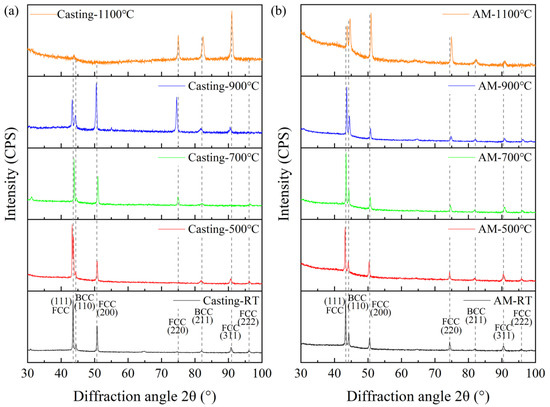 Figure 1. For the casting samples, the crystallographic composition of both phases remained unchanged up to a heat treatment temperature of 900 °C. At 900 °C, the FCC phase transitioned to a dominant (200) plane, with secondary contributions from the (220) and (111) planes, while the BCC phase retained its primary (110) orientation. When the heat treatment temperature was increased to 1100 °C, the FCC phase was primarily characterized by the (311) plane, with a minor contribution from the (220) plane, and the BCC phase completely transformed to the (211) plane. In contrast, for the AM samples, the FCC phase maintained its dominant (111) orientation, with a minor (200) contribution, and the BCC phase remained primarily (110)-oriented up to a heat treatment temperature of 1100 °C. At 1100 °C, the FCC phase shifted to a dominant (200) plane, with secondary contributions from the (111) and (220) planes, while the BCC phase retained its primary (110) orientation. Based on the XRD results, it is evident that the phase structure of the casting samples underwent significant changes under heat treatment. In contrast, the AM samples demonstrated remarkable phase stability at lower heat treatment temperatures (≤900 °C), although higher temperatures still induced phase transformations.