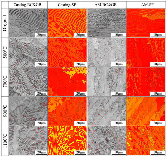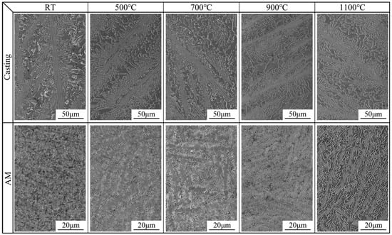 23]. With increasing heat treatment temperatures, the casting samples maintained the integrity of their eutectic morphology, with no significant changes in grain or phase structure size. Similarly, the AM samples demonstrated excellent stability in eutectic morphology, grain size, and phase structure dimensions after heat treatment at temperatures below 900 °C. However, after heat treatment at 1100 °C, the lamellar eutectic structure in the AM samples was not evident, and a noticeable increase in phase structure dimensions was observed, as shown in
