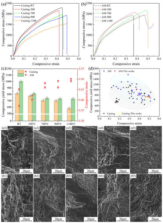 Figure 4c. With increasing heat treatment temperatures, the compressive yield strength of the casting samples gradually decreased, while the compressive strain showed a corresponding increase. Similarly, the compressive strain of the AM samples also increased with higher heat treatment temperatures; however, the compressive yield strength exhibited only a marginal decrease after 700 °C. This suggests that the AM samples possess superior resistance to high-temperature softening compared to the casting samples. By summarizing the compressive properties of EHEAs with FCC+BCC phase structures, it is evident that despite changes in eutectic morphology and phase structure induced by heat treatment, the mechanical properties of both casting and AM samples remained within an optimal range, as shown in
