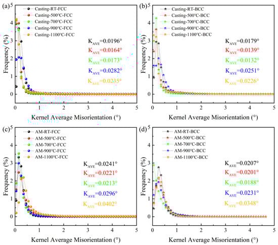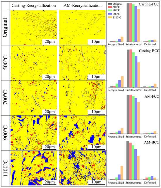 28]. After heat treatment at 900 °C, a significant increase in recrystallized regions is observed in both FCC and BCC phases of the two samples, with the amount gradually increasing as the heat treatment temperature rises. Similarly to the 700 °C condition, the BCC phase in the samples exhibits a higher number of recrystallized grains, which is attributed to the higher structural stability of the FCC phase compared to the BCC phase at elevated temperatures [