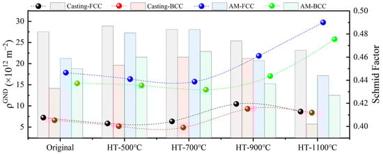 Figure 8. Overall, the dislocation density in the additively manufactured parts is significantly higher than that in the casting parts. This is attributed to the non-equilibrium rapid solidification process inherent to additive manufacturing, which on one hand leads to insufficient atomic arrangement and subsequent atomic misalignment and on the other hand increases the constraints between the two-phase structures, grains, and adjacent melt pools, ultimately resulting in a higher dislocation density in the components. The dislocation density in the FCC phase is consistently higher than that in the BCC phase, which is associated with the FCC phase’s greater capacity to accommodate dislocations [