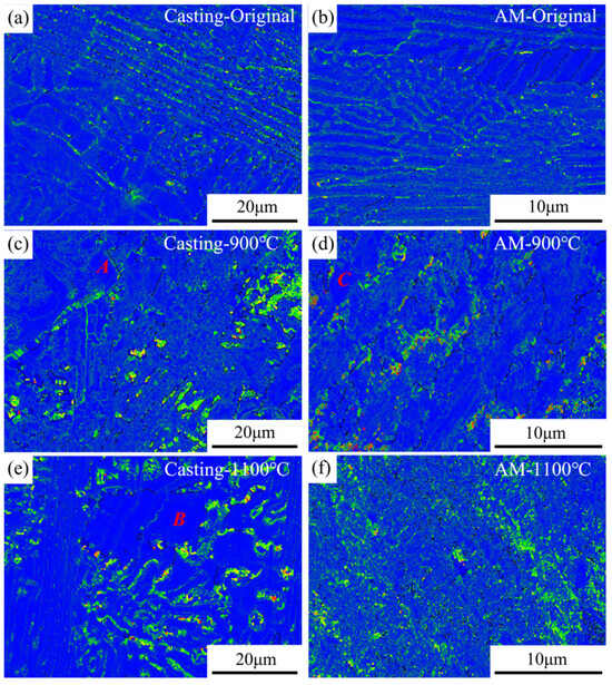 Figure 3. First, both the casting and AM samples consisted of FCC and BCC phases, consistent with the XRD results. Second, the casting samples exhibited excellent stability in eutectic morphology, with no significant changes observed, whereas the AM samples showed fragmented eutectic morphology and a loss of lamellar characteristics after heat treatment at 1100 °C. Finally, the IPF analysis revealed that the phase orientation within individual grains of the casting samples was highly uniform, while adjacent grains exhibited distinct IPF variations. A similar phenomenon was observed in the AM samples under low-temperature heat treatment (below 1100 °C). However, after heat treatment at 1100 °C, the uniformity of phase orientation within grains underwent a qualitative transformation. Combined with the preceding experimental results, it is evident that 1100 °C represents a critical threshold for heat treatment in both casting and AM samples, significantly influencing their microstructural evolution.