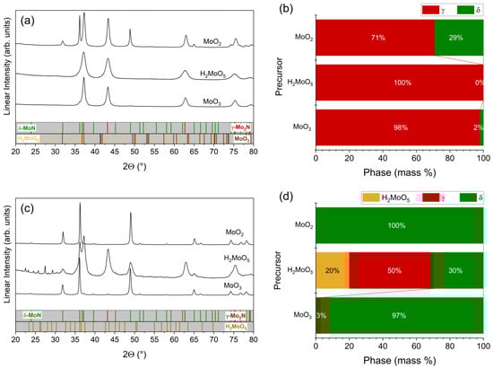 The choice of the precursor also strongly influenced the nature of the resulting phases, Figure 2, with the phase fraction of δ-MoOxNy increasing in the sequence MoO2 > MoO3 > H2MoO5. Under conventional anhydrous conditions, the precursor H2MoO5 produced only γ-MoOxNy, consistent with prior studies of this reagent [27,28], whereas MoO3 and MoO2 reagents yielded, respectively, 2 and 29 mass % of δ-MoOxNy in the product phases. The production of a mixture of δ-MoOxNy and γ-MoOxNy from dry ammonolysis of MoO2 agrees with our prior in situ study of this precursor, where it was found that the two product phases co-existed between ~675 and 800 °C, with the precursor being completely consumed at ~700 °C [29]. Jaggers et al. similarly observed that ammonolysis of MoO2 resulted in a mixture of γ and δ phases under conditions that produced only γ from MoO3 [4]. Introduction of 2% steam increased the phase fraction of δ-MoOxNy regardless of the precursor (as already noted for MoO3). In the case of H2MoO5, the product mixture following hydrous ammonolysis contained 30 mass % δ-MoOxNy, along with 50 mass % γ-MoOxNy and unreacted precursor. Thus, steam both suppressed ammonolysis of H2MoO5 and shifted the nature of the product from γ-MoOxNy towards δ-MoOxNy. Hydrous ammonolysis of MoO2, resulted in phase-pure δ-MoOxNy (at the level of impurity phase detection by laboratory XRD), a dramatic shift from only 29 mass % of this phase under anhydrous conditions. While higher steam concentrations were not examined for these precursors, because ammonolysis of MoO3 under higher steam concentrations (2.46%) yielded MoO2 as a major product, it can be readily concluded that higher steam when using MoO2 as the reagent would also result in the presence of the dioxide in the product.
