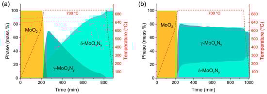 The results of the reaction pathway studies, Figure 4 (see also Supplementary Materials Figure S3), revealed that under both dry and humidified ammonia, the product phases δ-MoOxNy and γ-MoOxNy appeared simultaneously, with these phases first detected at a slightly lower temperature in the humidified environment (670 °C) than the dry environment (690 °C). In both experiments, consumption of the precursor occurred rather rapidly, with MoO2 being completely absent within a few minutes of reaching 700 °C. The precursor is just barely detected upon reaching the hold temperature and is absent in the next measurement, recorded after 30 min. Further similarity between the two conditions is evident in the initial phase assemblage, with the cubic γ-MoOxNy phase being the dominant product at the initial stages of reaction. Differences between the two results emerge during the 700 °C hold. Over this period, the phase fraction of γ-MoOxNy in the humidified experiment peaks then gradually declines until only δ-MoOxNy remains. In contrast, under dry conditions, the phase fraction of cubic γ-MoOxNy only gradually decreases towards a plateau value (of approximately 75 mass %) after attaining a peak value of ~82 mass %. Thus, the presence of H2O in the gas stream does not appear to facilitate the direct transformation from MoO2 to δ-MoOxNy in a manner that bypasses γ-MoOxNy. Instead, it appears to catalyze the transformation from γ-MoOxNy to δ-MoOxNy.