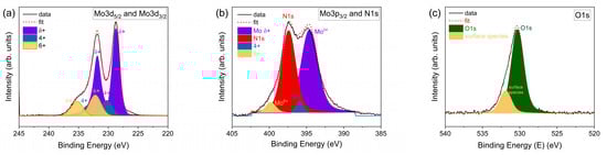 Qualitative chemical analysis was performed by XPS using a Thermo Scientific ESCALAB 250Xi instrument (Eindhoven, The Netherlands), equipped with an aluminum anode (Al Kα = 1486.6 eV) X-ray source, an electron flood gun, a scanning ion gun, and a heating stage. Samples were prepared by compacting the powders into a disc, 3.2 mm in diameter. Because Ar etching, which is typically used to remove surface species, is known to modify cation oxidation states in metal oxides [38], the contribution of adsorbed gases to the signal (potentially N2, H2O, NH3, H2) was minimized by performing measurements at elevated temperature. Once inside the measurement chamber, the sample was slowly heated to 250 °C and held until the vacuum stabilized at ≈1.3 × 10−5 Pa, which required approximately 45 min. Following an initial survey scan which revealed the presence of Mo, N, and O in the oxynitride samples, high resolution data were collected in the Mo3d (220 eV to 240 eV), C1s (279 eV to 298 eV), and O1s (520 eV to 545 eV) regions, using a step size of 0.1 eV with a dwell time of 50 ms and integrating over 10 scans. Charging effects were corrected by referencing to the adventitious carbon Cls binding energy at 284.8 eV. The commercial software package Thermo Scientific™ Avantage (v. 5.9) was used for data processing. The instrument energy resolution of 0.10 eV was taken as the uncertainty in the binding energies determined by this analysis. The attributes of the Mo3d XPS peaks were established by fitting doublets with standard constraints (Mo3d5/2 and Mo3d3/2 with intensity ratio 3/2 and ∆BE ≈ 3.15 eV). Peaks due to three species were resolved: Mo6+ at a BE of ≈232.5 eV, Mo4+ at a BE of ≈230.1 eV and Mod+ at a BE of ≈228.7, with the assignments based on literature studies of molybdenum oxides [5,28,32,37].