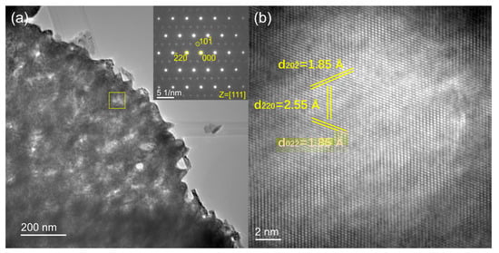 Transmission electron microscopy study of δ-MoOxNy: (a) TEM image with inset showing the SAED pattern along the [111] zone axis; and (b) HRTEM image obtained from the highlighted region in (a). Selected lattice planes and their corresponding distances are marked in (b).