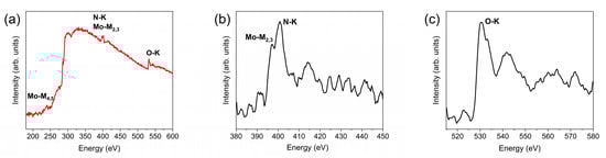 Electron energy loss spectroscopy study of δ-MoOxNy: (a) core-loss EELS recorded with a dispersion of 0.25 eV/ch to resolve the position and shape of the Mo-M-4,5, Mo-M2,3, N-K, and O-K edges, (b) the electron-energy-loss near edge structure (ELNES) of the Mo-M2,3 edge, and (c) the ENLES of the O-K edge.