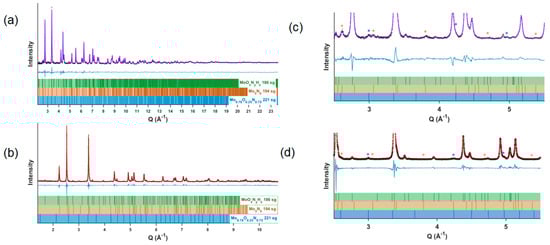 Measured and calculated powder diffraction patterns, the latter from co-refinement of δ-MoOxNyHz using combined (a,c) neutron powder diffraction and (b,d) X-ray synchrotron data. Measured NPD data in (a,c) are shown as black crosses (×) and calculated patterns as solid purple lines. Measured XRD data in (b,d) are shown as black plus symbols (+) and calculated patterns as solid red lines. Below each plot, the peak positions for the main phase (P63mc, 88.35(9) wt.%, green), the secondary Mo5N6 phase (P63/mmc, 9.71(8) wt.%, brown) and the secondary γ-MoOxNy phase (Pmm, 1.94(4) wt.%, blue) are shown as vertical lines. Visible secondary phase peaks that do not overlap with those of the main phase are marked with * in (c,d). Rietveld refinement residuals: NPD 3.509%, XRD 15.009%, overall wR = 7.830%, and GOF = 1.62.