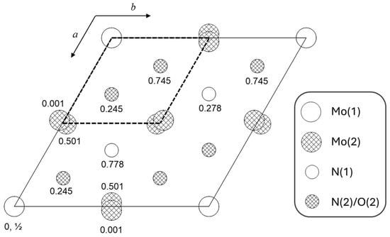 Structure of δ-MoOxNy (space group P63mc) projected along the c-axis. The numbers indicate z-coordinates. The dashed unit cell is that of the NiAs subcell. For clarity, hydrogen atoms are omitted from the figure. They are located at 1/3, 2/3, 0.575, nearly midway between Mo(1) atoms along the z-axis, with a site occupancy of 4.8%.