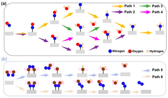 The eNORR reaction involves multiple reaction pathways (see Figure 4). The selectivity of the eNORR process is significantly influenced by NO concentration. At low NO concentrations, NH3 serves as the final product (as shown in Figure 4a), while at high NO concentrations, N2 and N2O are formed due to dimerization of NO (N2O2). In this scenario, since NH3 is the target product, a series of distinct pathways are followed and each pathway involves five protonation steps to yield NH3. At high NO concentrations, multiple two-pathway branches emerge, with N2 and N2O being formed through dimerization [26].