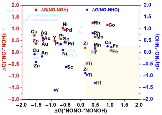The potential and efficiency of the eNORR reaction is typically evaluated based on its potential determination step (PDS), which is marked by the most substantial increase in Gibbs free energy change (∆G) along the reaction pathway. In this context, processes such as the initial protonation of *NO to form *NOH or *NHO, and the protonation of *NONO to yield *NONOH, are commonly considered as the PDS [63]. To further evaluate the catalytic activity and product selectivity of the 16 catalysts, the ∆G values for the initial hydrogenation steps were calculated, specifically for the pathways from *NO→*NOH (*NO→*NHO) to NH3 and from *NONO→*NONOH to N2. As illustrated in Figure 5, for the Ti@WS2, Mn@WS2, Fe@WS2, Co@WS2, Zr@WS2, and Hf@WS2 catalysts, the ∆G values of PDS for the *NO→*NOH or *NO→*NHO steps are lower than those for the *NONO→*NONOH step, indicating that these six catalysts preferentially form NH3, making them potential candidate catalysts.