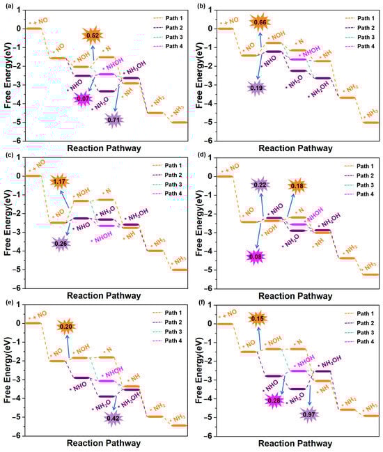 The eNORR process is initiated by the adsorption of NO on the catalyst surface, resulting in the formation of the *NO species. Following this, protons from the electrolyte approach and interact with the *NO species, driving the formation of *HNO or *NOH. Subsequently, a series of hydrogenation steps occur, ultimately resulting in the formation of NH3. As shown in Figure 6a, the most favorable reaction pathway for the Ti@WS2 catalyst is Path3. Along this pathway, all elementary steps are exergonic (∆G < 0 eV), indicating that the eNORR process occurs spontaneously. Consequently, the UL of the Ti@WS2 catalyst is 0 V. As shown in Figure 6b,c, for both the Mn@WS2 and Co@WS2 catalysts, Path2 is selected as the most favorable reaction pathway. In this pathway, the eNORR process can occur after overcoming a potential barrier (corresponding to ∆G of *NO→*NHO) of 0.19 eV for Mn@WS2 and 0.26 eV for Co@WS2. For Fe@WS2 (Figure 6d), Path3 emerges as the most favorable pathway, featuring a minimal energy barrier of 0.08 eV during the transition from *NO to *NHO. For the Zr@WS2 catalyst (Figure 6e), the most favorable reaction pathway is Path4, along which all elementary steps are exergonic, suggesting that the eNORR proceeds spontaneously at 0 V electrolyte potential. For the Hf@WS2 catalyst, as shown in Figure 6f, the most favorable pathway is identified as Path4, with a barrier height of 0.15 eV. In particular, in an acidic environment, the transformation of NH3 into NH4+ proceeds rapidly, primarily because this process releases a significant amount of energy [22,26,35]. As a result, the desorption of NH3 is not taken into account when evaluating the performance of all six catalysts.