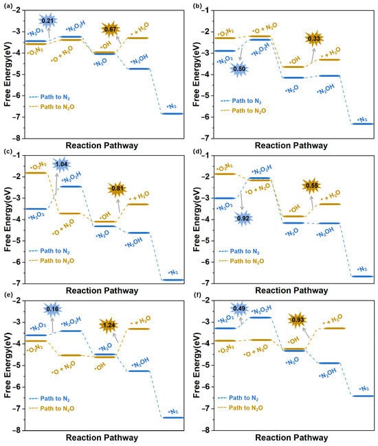 Free energy diagrams of eNORR to N2O/N2 over six TM@WS2 catalysts. (a) Ti@WS2; (b) Mn@WS2; (c) Fe@WS2; (d) Co@WS2; (e) Zr@WS2; (f) Hf@WS2.