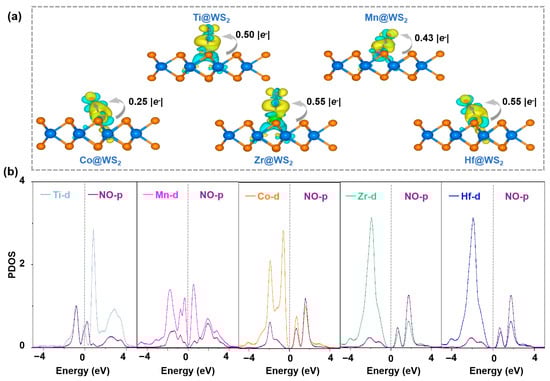 (a) The charge density difference maps of five TM@WS2 catalysts. In these visualizations, the isosurface threshold is 0.003 e/Å3, yellow regions signify areas of charge accumulation, while cyan regions indicate charge depletion; (b) partial density of states (PDOS) of NO adsorbed on five TM@WS2 catalysts.