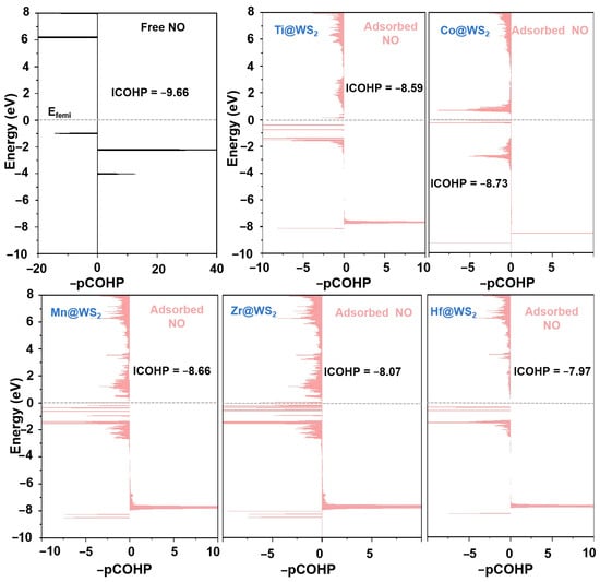 As demonstrated in Figure 11, upon NO adsorption, the COHP of the adsorbed *NO exhibits a greater number of antibonding states compared to that of the isolated NO molecule. Additionally, the ICOHP (N-O) values for the N-O bond of *NO adsorbed on Ti, Mn, Co, Zr, and Hf@WS2 catalysts are −8.59, −8.66, −8.73, −8.07, and −7.97, respectively. It is evident that this is less pronounced in negativity compared to that of the isolated NO molecule (−9.66), indicating a substantial weakening of the N-O bond upon adsorption.