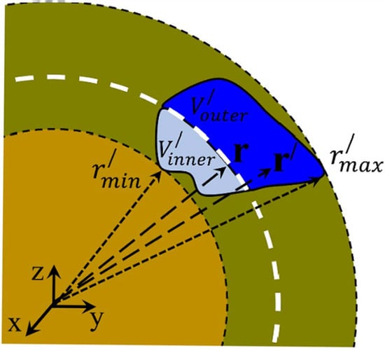 The ‘shell of observation’ is the cornerstone of our physical argumentation. It is a spherical surface (of negligible thickness/volume) considered to be free of any charge, i.e., vacuum, that traces the radial direction from to . Thus, it defines the interface that divides the former volume of the charge density, , into two subvolumes, and , of charge density and , respectively. The spherical form of the ‘shell of observation’ is necessitated by the obvious compatibility with the expansion on the basis of SH employed in our approach. Accordingly, we can see that the calculation of over the ‘shell of observation’ inside can be obtained by taking into account the two distinct charge densities of subvolumes and (see Figure 2) through the appropriate expression of the multipole expansion. Thus, the scalar potential produced on the ‘shell of observation’ by the charge density, , residing in should be calculated through relations (9)–(10) of the outside space. Similarly, the scalar potential produced on the ‘shell of observation’ by the charge density, , hosted by should be calculated through relations (7) and (8) of the inside space. However, a crucial point must be clarified here. While in relations (7) and (9) of and , respectively, the radius, , of the ‘shell of observation’ is clearly identified in relations (8) and (10) of the respective multipole moments, and , the radius, , is somehow obscured. The crucial point is to realize that in the calculation of and , the radial integration should run within and in relation (8) and within and in relation (10). This means that the multipole moments, and , are no longer constants, they have become functions of the radius, , of the ‘shell of observation’. Thus, to calculate the scalar potential of the middle space, , we first must redefine the multipole moments through the following relations: