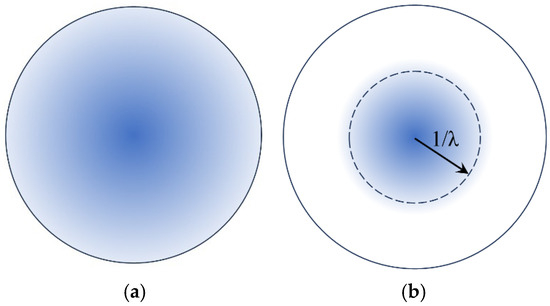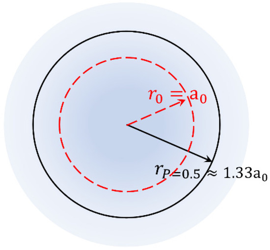 where is the Bohr radius ( and refer to the charge and mass of the electron). In Figure 3 below, we show an illustration of the ground state wave function, . Following relation (46), the scheme illustrates the case where the wave function exhibits only an exponential dependence on . Two characteristic radii are shown. The first one, , is specified by the demand that the electron should be observed within the volume enclosed by at a prescribed probability . In mathematical terms which for leads to the equation . The numerical solution of this relation results in . The second one, , is termed the most probable radius of electron orbiting and is defined as the maximum observed in the radial probability density function , which results in (see below and [45,46]).
