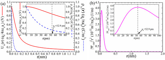 (a) Scalar potential, , relation (50), together with the respective charge density, , relation (47). (b) Radial probability density function, . In both cases, the main panel shows the graph in an extended range, while the inset focuses on a small range close to zero. In panel (a), the electron charge, , should be accompanied by the minus sign. In both panels (a,b), the value was used for the Bohr radius.