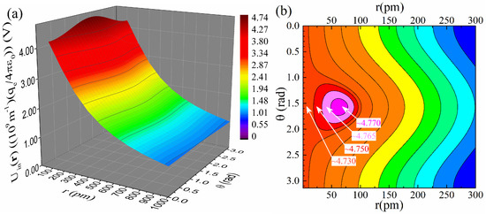 Figure 6a,b present plots of , relation (59), in 3D and contour form, respectively. The 3D plot, panel (a), renders an extended range, while the contour one, panel (b), focuses on a smaller range. At first sight, the scalar potential exhibits a somewhat conventional behavior, being maximum at the origin, that is, at the nucleus, while it decreases monotonously with radius, , as evidenced in panel (a). However, a closer inspection of the data simulated with high resolution reveals that exhibits a maximum located off-nucleus at . As evidenced by the displayed values of in the vicinity of the maximum is very weak, thus difficult to discern without simulations of high resolution and careful assessment of the respective data. On a quantitative basis, the percentage variation of in the vicinity of the maximum is .