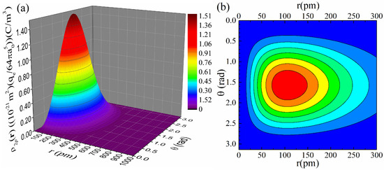 Figure 7a,b present the relevant plots of the charge density, , relation (52), in 3D and contour form, respectively. From both the 3D plot of panel (a), which renders an extended range, and the contour one of panel (b), which focuses on a smaller range, we see that exhibits a pronounced non-monotonous behavior with a maximum located away from the nucleus at .