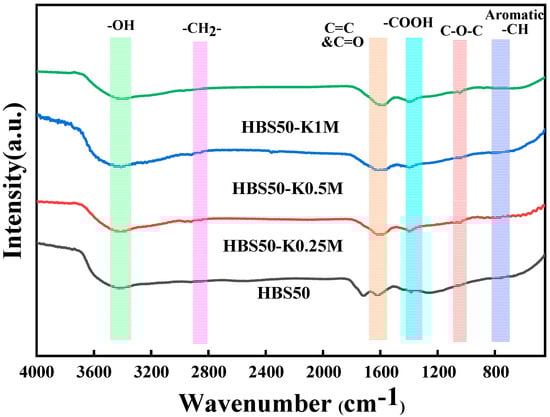 FTIR results of biochars are displayed in Figure 2, which illustrates the functional groups of HBS50, HBS50-K0.25M, HBS50-K0.5M, and HBS50-K1M. The -OH bonds between the hydroxyl group and the H2O molecule were stretched, resulting in broad and strong bands at 3450 cm−1 []. The -CH2 bonds were associated with the peaks at 2850 cm−1 []. The peaks near 1680 and 1590 cm−1 were due to the stretching vibrations of C=O and C=C [,]. The stretching vibration of -COO generates peaks near 1390 and 1250 cm−1, while the C-O-C bond appeared near the 1060 cm−1 peak []. Aromatic C-H is attributed to peaks at 800–600 cm−1 []. Notably, the adsorption peak enhancement of C-O-C and -COOH was observed in HBS50-KxM, indicating an increase in O-containing groups, which is in agreement with the results of the elemental analysis.