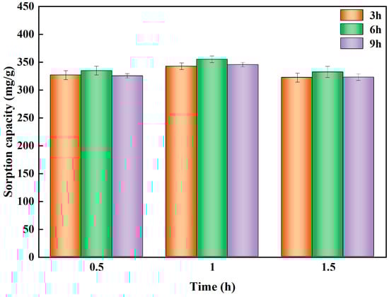 To determine the effect of different KOH solution concentrations on the sorbent performance in hydrothermal biochar. HBS50, HBS50-K0.25M, HBS50-K0.5M, and HBS50-K1M were used for sorbent experiments. As illustrated in Figure 3, the results of Pb2+ sorbent experiments on unmodified hydrothermal biochar and ultrasonic treatment by different KOH concentrations were presented. The Pb2+ sorption capacity of hydrothermal biochar was significantly improved through KOH ultrasonic treatment. Among them, the hydrothermal biochar (HBS50-K0.5M) treated by ultrasonic methods with 0.5 mol/L KOH solution had the best Pb2+ sorption capacity and removal rate (345.8 mg/g and 50.76%). Meanwhile, a preliminary investigation was conducted to determine the preparation conditions (sonication time and stirring time) of HBS50-K0.5M (Figure 4). HBS50-K0.5M exhibited the highest adsorption capacity by sonicating for 1 h and stirring for 6 h. Increasing ultrasound and stir time caused a slight decrease, which may be related to the collapse of pores. The increase in sorbent capacity was attributed to the corrosion of the hydrothermal biochar surface during KOH ultrasonic treatment, leading to the formation of abundant functional groups, thus improving its sorbent capacity []. It was noteworthy that when the KOH concentration increased to 1 M, the sorbent capacity and efficiency of hydrothermal biochar for Pb2+ were reduced. This was primarily because of the excessively high KOH concentration due to over-activation, causing the collapse of the carbon structure, destruction of carbon tissue, and loss of functional groups [].