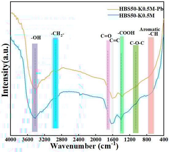 The changes in functional groups were found with FT-IR after Pb2+ sorption by the ultrasonic-assisted KOH activation biochars, as shown in Figure 7. It was clear that the binding of Pb atoms to the surface of the biochar caused the overall sorption intensity to decrease following sorption. Moreover, the distinctive peaks of -OH (3450 cm−1) as well as -COOH (1390 and 1220 cm−1) moved to the right, possibly due to complexation between Pb atoms as well as functional groups that incorporate oxygen []. The broadening and shifting of peaks at C=C (1590 cm−1) as well as C=O (1680 cm−1) was observed, suggesting π-π interactions between HBS50-K0.5M with Pb2+ [].
