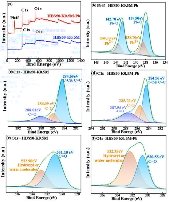 XPS analysis of HBS50-K0.5M and HBS50-K0.5M-Pb was carried out, and the pre-adsorption XPS revealed that the adsorbed material consisted of the elements C and O, while the post-adsorption consisted of the elements C, O, and Pb, as shown in Figure 8. In Figure 8a, the HBS50-K0.5M-Pb spectrum exhibits characteristic peaks of Pb 4f, indicating the successful binding of Pb atoms to the biochar surface. Figure 8b shows the Pb 4f spectrum of HBS50-K0.5M-Pb, where most Pb atoms on the biochar surface were found in Pb-O, as well as a small amount of Pb2+, indicating that most Pb atoms underwent complex reactions with oxygen-containing functional groups resulting in the generation of complex compounds, such as 2O-Pb, 2COO-Pb, COO-Pb-O. Furthermore, a tiny percentage of Pb atoms are bonded to the surface of the biochar by π-π bonds, as well as electrostatic attraction []. The presence of chelating interactions between Pb atoms and oxygen-containing functional groups is further demonstrated by the C 1s spectra shown in Figure 8c,d, which show a small decrease in the binding energies of -C=O (288.01 eV), as well as C-O (286.09 eV) bonds after sorption [,]. The π-π bonding effect on unsaturated carbon bonds was thought to be responsible for the shift seen at 284.56 eV, which corresponds to C-C as well as C=C bonds. According to the O1s spectra in Figure 8e,f, the peak at 531.10 eV denotes C=O functionality, while the peak at 532.90 eV represents hydroxyl groups or water molecules []. The slight decrease in binding energies for these peaks after sorption implies a chelating interaction between Pb atoms and oxygen-containing functional groups [].