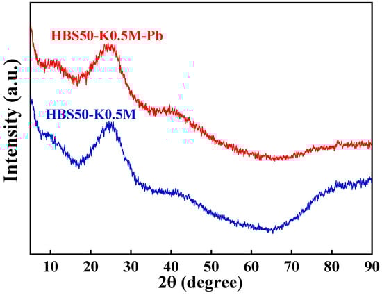 According to previous studies, ion exchange and precipitation reactions have been considered potential mechanisms for biochar’s sorption of Pb2+ []. To investigate these two potential sorption mechanisms, this study utilized ICP–OES to measure the concentrations of Na, Mg, K, and Ca, i.e., common alkali metal elements, in the solution before and after sorption (Table 4) and conducted X-ray diffraction (XRD) analyses on samples HBS50-K0.5M and HBS50-K0.5M-Pb to verify the presence of any Pb(II) precipitates (as shown in Figure 9). In the XRD pattern of HBS50-K0.5M and HBS50-K0.5M-Pb, a broad peak near 23° associated with the (002) diffraction plane of disordered amorphous carbon was observed [,]. Furthermore, no precipitates containing Pb elements were detected, indicating that precipitation was not the dominant mechanism in the sorption process of HBS50-K0.5M for Pb2+. Table 4 indicates that the concentrations of Na, Mg, as well as Ca in the sorption solution, remained almost unchanged before and after the sorption experiment, while the concentration of K element in the solution increased by 20.9 mg/L after sorption, indicating that K ions attached to the surface of biochar by complexation or electrostatic attraction and exchange with Pb2+ ions in solution take part in adsorption. The exchange of Pb2+ ions in solution is shown in Equation (16).