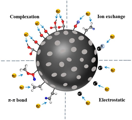 Lead is one of the most toxic and carcinogenic heavy metals. The discharge of lead without effective treatment poses a threat to the environment and human health []. Lead contamination not only damages soil and water quality but also enters living organisms through the food chain and water, causing serious damage to the central nervous system, kidneys, and reproductive system and increasing the risk of illness and even death []. In response, numerous conventional and innovative approaches have been employed to address wastewater treatment, like ion exchange processes, membrane filtration systems, chemical precipitation techniques, electrochemical treatment technologies, and reverse osmosis methods [,]. These techniques can meet discharge standards for lead-containing wastewater, but they have certain disadvantages, including insufficient treatment, costly equipment, high labor as well as monitoring costs, chemically intensive systems, the production of secondary contaminants (such as sludge and solid waste), as well as the requirement for additional treatment []. Sorption has been found to be an effective and convenient method. Among the many types of adsorbents, carbon materials are known for their excellent sorption stability with little or no secondary contamination [,]. In particular, carbon materials made from different biomasses (i.e., biochar) have received more attention because of their high adsorption capacity, easy synthesis, and low cost [,]. Thus, biochar has broad prospects in removing Pb2+.