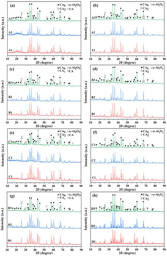XRD patterns of CA6-based insulating castables after heat treatment at 1000 °C (a,c,e,g) and 1300 °C (b,d,f,h).