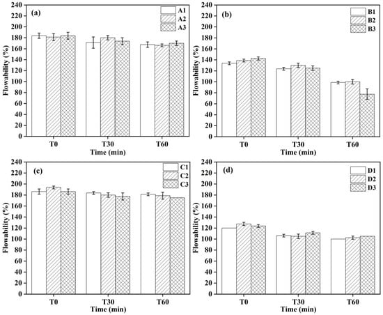 Flowability of CA6-based insulating castables: (a) A1–A3, (b) B1–B3, (c) C1–C3 and (d) D1–D3.