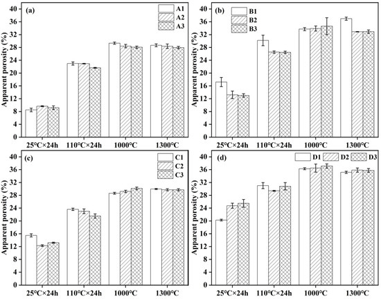 Apparent porosity of CA6-based insulating castables: (a) A1–A3, (b) B1–B3, (c) C1–C3 and (d) D1–D3.