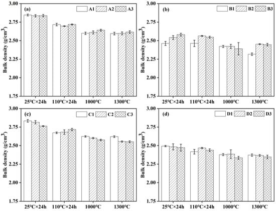 Bulk density of CA6-based insulating castables: (a) A1–A3, (b) B1–B3, (c) C1–C3 and (d) D1–D3.