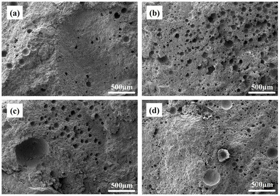 Figure 5 shows the microstructure of castables with 10 wt.% CAC. The apparent porosity of sample A3 was relatively low, as seen in Figure 5a. The formation of spherical pores was mainly related to excess water, which would evaporate at high temperatures. From Figure 5b, it can be seen that pores were more widely distributed in sample B3, which was a consequence of the addition of an air-entraining agent. Larger pores (greater than 400 µm) were left after the spalling of alumina bubbles in sample C3, as shown in Figure 5c. As a whole, there were fine pores derived from the air-entraining agent and separate pores with a size larger than 100 µm from the addition of alumina bubbles in sample D3 (Figure 5d). In broken alumina bubbles, block crystals of alumina different from CA6 can be observed.