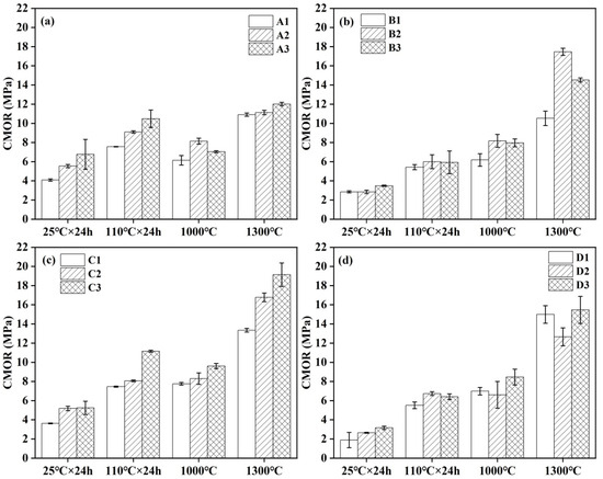CMOR of different groups of CA6-based insulating castables: (a) A1–A3, (b) B1–B3, (c) C1–C3 and (d) D1–D3.