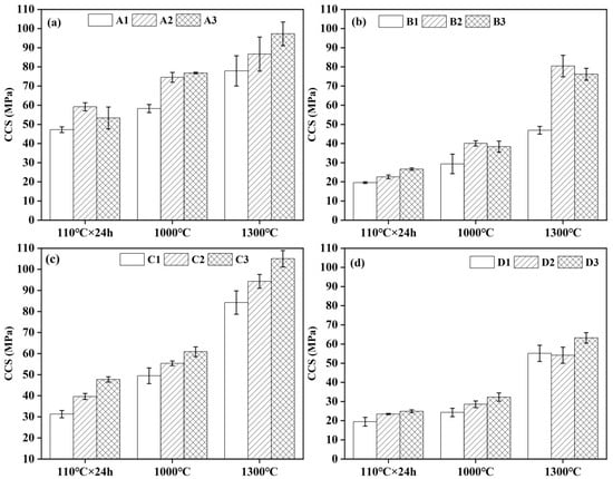 CCS of different groups of CA6-based insulating castables: (a) A1–A3, (b) B1–B3, (c) C1–C3 and (d) D1–D3.
