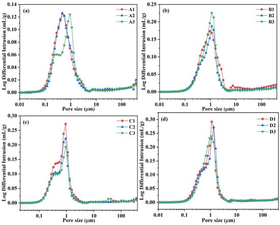 Pore size distribution of CA6-based insulating castables after firing at 1300 °C for 3 h: (a) A1–A3, (b) B1–B3, (c) C1–C3 and (d) D1–D3.
