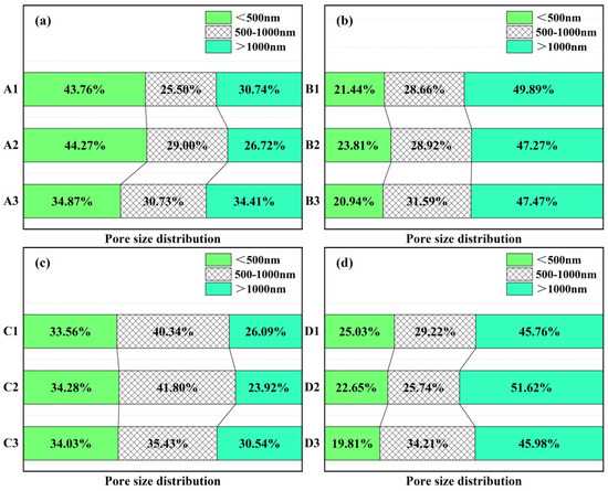 Figure 9 presents a statistical diagram depicting the percentage of pore volumes corresponding to pore sizes smaller than 500 nm, between 500 and 1000 nm, and larger than 1000 nm for each group. The pore size distribution exhibited significant variations among the sample groups. In samples with the absence of additives (A1–A3), the pore size predominantly fell below 500 nm. As the CAC content increased, the proportion of pores smaller than 500 nm initially rose but decreased significantly at 10 wt.% CAC, with a corresponding increase in pores larger than 1000 nm. The addition of an AEA (B1–B3) led to a substantial increase in pores larger than 1000 nm, accounting for nearly half of the total pore volume. In contrast, alumina-bubble-incorporating samples (C1–C3) exhibited a relatively balanced pore size distribution, with the proportion of pores between 500 and 1000 nm peaking at 9 wt.% CAC. Combining both additives (D1–D3) resulted in a pore size distribution skewed towards the 500–1000 nm range, with pores larger than 1000 nm constituting 45.8% to 51.6% of the total pore volume. Under the action of a combined air-entraining agent and alumina bubbles, the proportion of pore diameters larger than 1000 nm in sample D2 reached the maximum value of 51.62%, while the proportion of pores less than 500 nm was reduced below 20% if the cement content was 10 wt.%.