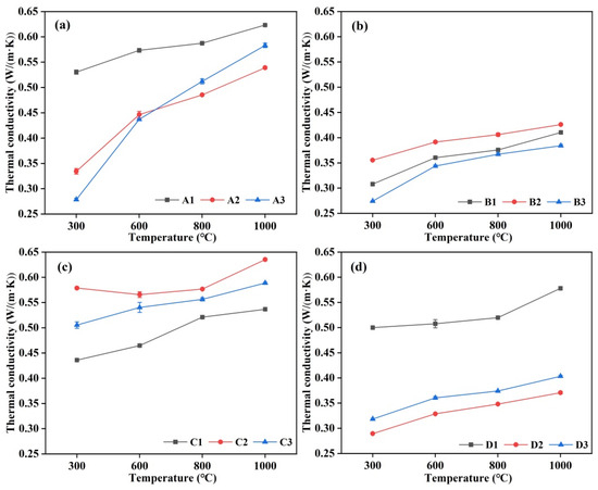 Thermal conductivity of CA6-based insulating castables after treated at 1300 °C for 3 h: (a) A1–A3, (b) B1–B3, (c) C1–C3 and (d) D1–D3.