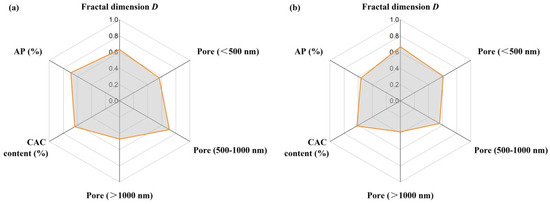 Following Lv Feng’s study [37], the recognition coefficients were determined as 0.35, 0.35, and 0.3, respectively. The grey correlation degrees of cement content, apparent porosity, pore fractal dimension, and pore size distribution fractions (across specific ranges) to CMOR, CCS, and thermal conductivity were calculated.