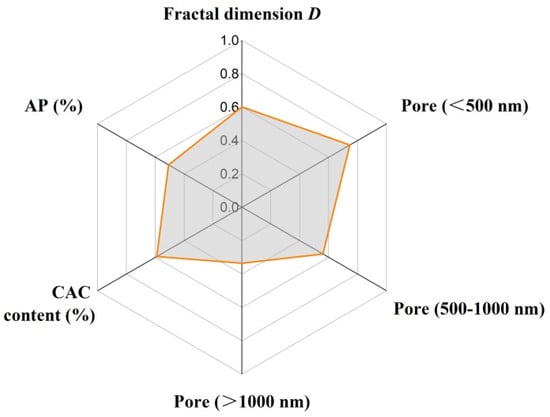 Figure 11 presents the calculated grey correlation degrees between other parameters and strength based on GCA. The results demonstrated that the grey correlation degrees of pores with a size in the range of 500–1000 nm and apparent porosity were highest for CMOR, followed by CAC content and the pore fractal dimensions, while pore fractal dimensions had a maximal effect on CCS, and CAC content and pores smaller than 500 nm were the second and third related factors respectively. Grey correlation degrees between other parameters and the thermal conductivity of castables at 1000 °C are shown in Figure 12. The grey correlation degree of pores smaller than 500 nm was 0.75, suggesting that finer pores played an important role in thermal conductivity. Meanwhile, the grey correlation degrees of pore fractal dimensions and CAC content were around 0.6. Optimizing the performance of castables through adjusting the cement content can be achieved by changing the pore size distribution and complexity of pores.