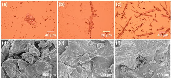 (a–c) Metallographic microscope characterization of materials: (a) EP, (b) CIN, and (c) CIN/EP. (d–f) SEM images of materials: (d) EP, (e) CIN/EP, and (f) CIN/EP-ZrO2.