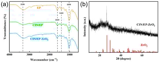 Figure 2a shows the FTIR spectra of EP, CIN/EP, and CIN/EP-ZrO2. In the spectrum of EP, characteristic peaks are located at 1030, 1410, 1610, and 3330 cm−1. The strong peak at 1030 cm−1 is assigned to the stretching vibrations of C-O-C glycosidic bonds and C-O in polysaccharides, confirming the polysaccharide structure of EP. The absorption peaks at 1410 and 1610 cm−1 likely correspond to the N-H bending and the C-N stretching vibrations, or the C=O and O-H bending vibrations []. The peak at 1610 cm−1 in CIN/EP also indicates the C=C stretching vibrations from CIN’s aromatic structure, suggesting its retention during the composite process []. In the spectrum of CIN/EP-ZrO2, the characteristic peak at 1060 cm−1 shows no significant shift, indicating no chemical cleavage of CIN’s aromatic structure, but the physical adsorption of CIN onto the EP surface. A broad peak at 3330 cm−1 is ascribed to the O-H and N-H stretching vibrations in polysaccharides and proteins of EP.