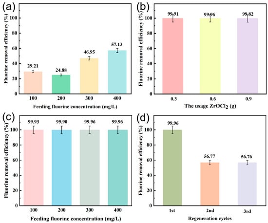 (a) Removal efficiency of EP for different concentrations of F−, (b) removal efficiency of the CIN/EP-ZrO2 composite membranes with different ZrO2 loading (F− concentration is 300 mg/L), (c) removal efficiency of the CIN/EP-ZrO2 composite membrane for different concentrations of F−, (d) regeneration test of the CIN/EP-ZrO2 composite membrane on F− removal efficiency.