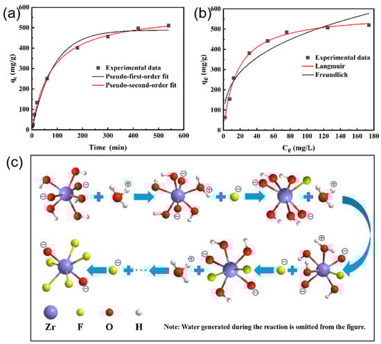 (a) Pseudo-first-order and pseudo-second-order adsorption kinetics of F− of the CIN/EP-ZrO2 composite membranes. (b) Simulation of isothermal adsorption of F− by the CIN/EP-ZrO2 composite membrane. (c) Adsorption mechanism of F−.