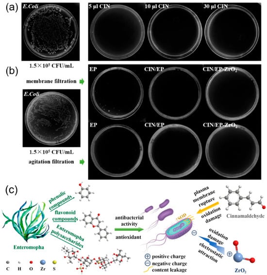 The antimicrobial ability of the CIN/EP-ZrO2 composite membranes: (a) antimicrobial effects of different amounts of CIN, (b) antimicrobial effects of stirring and membrane filtration of EP, CIN/EP, and CIN/EP-ZrO2, and (c) antibacterial mechanism.
