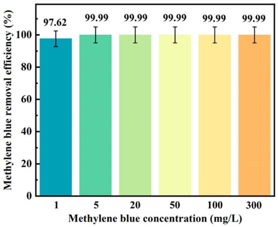 We further investigated the dye adsorption properties of the CIN/EP-ZrO2 composite membranes. As shown in Figure 6, when the initial concentration of the MB solution was 1 mg/L, the removal rate reached 97.62%. When the initial concentrations of MB solution were 5, 20, 50, 100, and 300 mg/L, the removal efficiency could reach 99.99% in all cases. The results indicate that the CIN/EP-ZrO2 composite membranes have excellent dye adsorption performance.