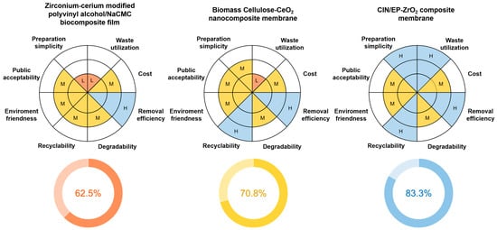 In recent years, public awareness of environmental protection has been increasing, and it is essential to conduct sustainability assessments. In order to evaluate the sustainability of the CIN/EP-ZrO2 composite membrane, we used the overall sustainability footprint (OSF) analysis by selecting eight factors, including the preparation simplicity, public acceptance, environmental friendliness, recyclability, degradability, removal efficiency, cost, and waste utilization rate, which were divided into low (L, i = 1), medium (M, i = 2), and high (H, i = 3) levels and calculated according to Equation (1).